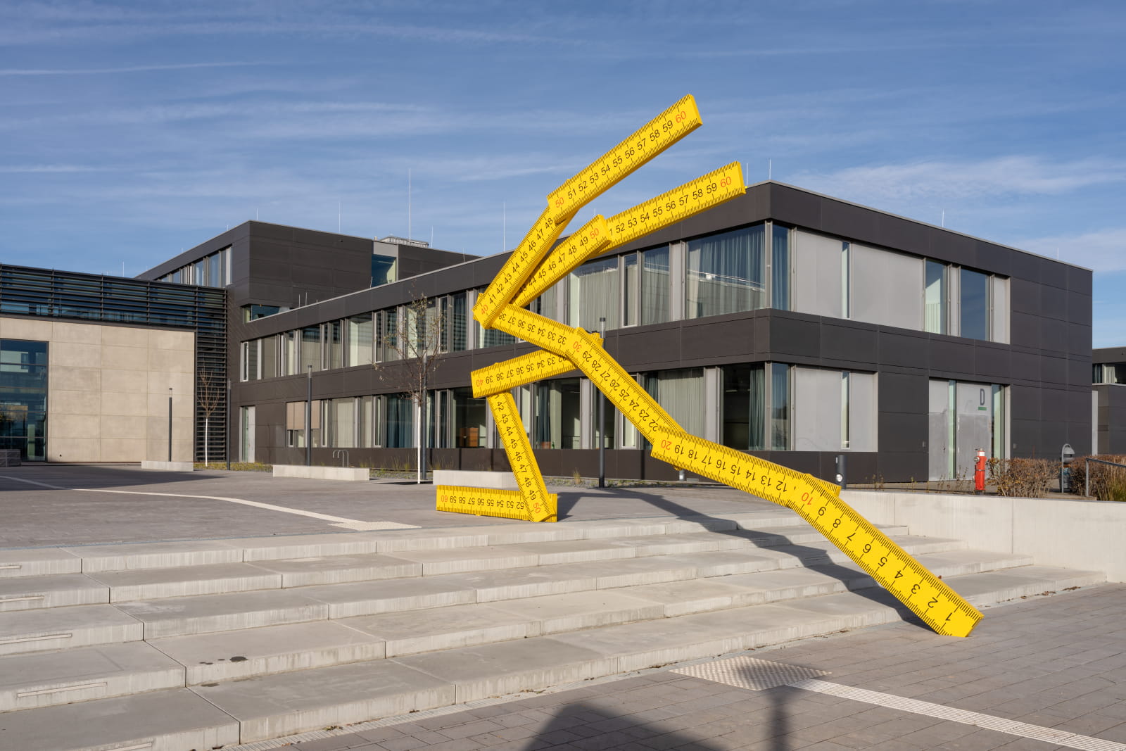In front of Mainz University of Applied Sciences, a sculpture shaped like an oversized ruler, opened out to its full length, marks the main entrance. This everyday measuring tool becomes a symbol of movement, curiosity, and precision—qualities that unite teaching, research, and design at the university.